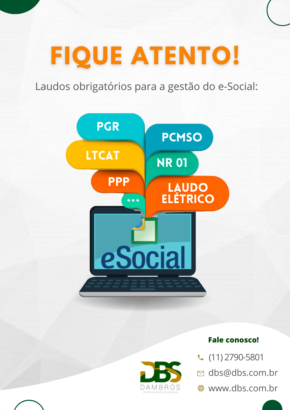 Para uma gestão completa do envio dos eventos de SST (Saúde e Segurança do Trabalho) ao e-Social, é necessário que a empresa esteja em dia com os laudos obrigatórios, alguns como: